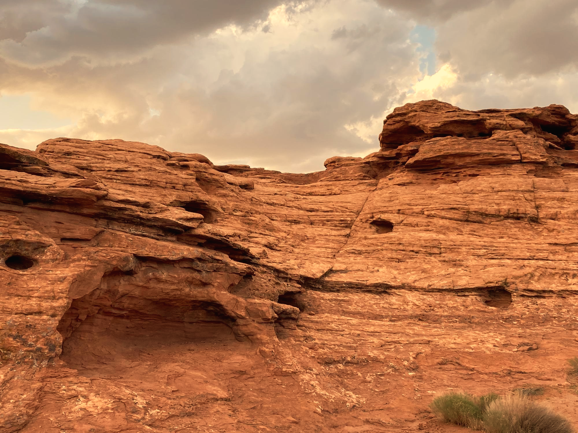 붉은 사암에 구멍이 뚫리고 물에 잠긴 흔적이 물결친다