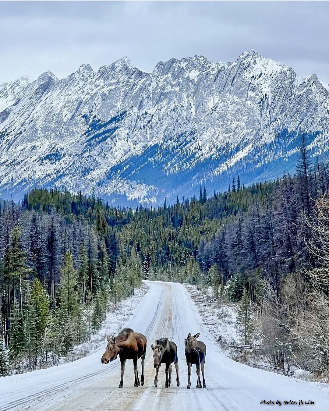 웅장한 산을 배경으로 누구나 좋아하는 무스가족이 눈 덮힌 도로의 한 가운데에서 기막힌 조화로 보는 눈과 마음이 즐겁다